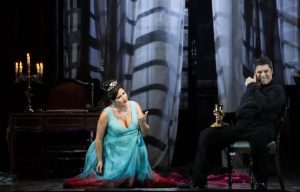 Anche l’abito indossato dalla primadonna nel secondo atto non colpisce particolarmente, abituati come siamo ad abiti sontuosi per la scena più importante di tutta l’opera, in genere di colore rosso, e, anche se il turchese dona molto alla bellissima Anna Netrebko, non è l’abito che nell’immaginario comune ci si aspettava.