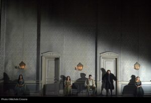 La scena è un continuo roteare che svela le varie stanze del palazzo di Don Giovanni:la camera da letto, salottini e corridoi, con diverse porte che sono utilizzate dai protagonisti per scappare, nascondersi. Questo gioco dà la possibilità all’opera stessa di dipanarsi senza interruzioni di sorta per eventuali cambi scena. Tutto scorre in un turbinio ordinato tra luci soffuse o ombre.